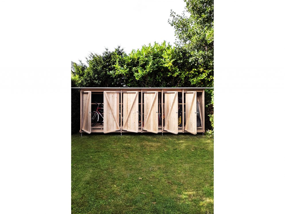 Der neue Baukörper bildet ein Gegenüber zur Gartenfassade des Wohnhauses und nimmt deren strukturelle Metrik auf. Einem Regal gleich, ist der Schuppen nicht begehbar und kann über Drehtüren beschickt werden. Die einfache, elementierte Holzkonstruktion ist für den Selbstbau ausgelegt und wird auf Punktfundamente ca. 30cm über der Geländeoberfläche aufgestellt.