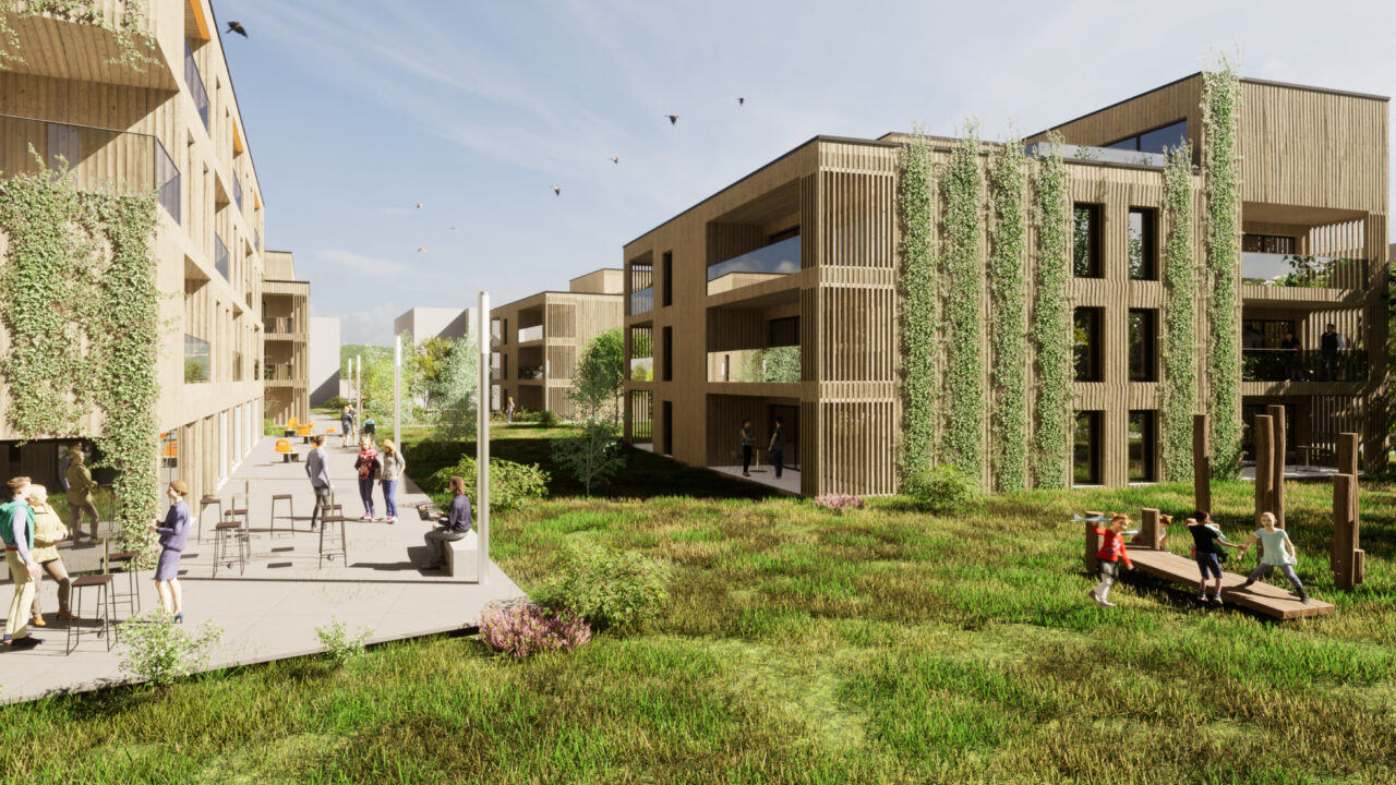 Strom wird über Photovoltaik-Module auf den begrünten Flachdächern gewonnen und kann bei Bedarf über Ladestationen E-Autos versorgen.