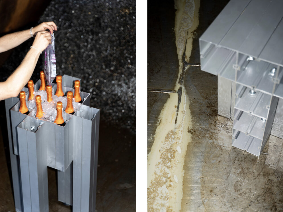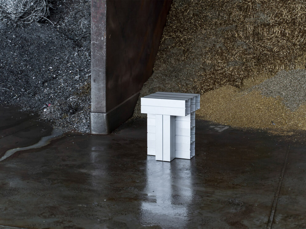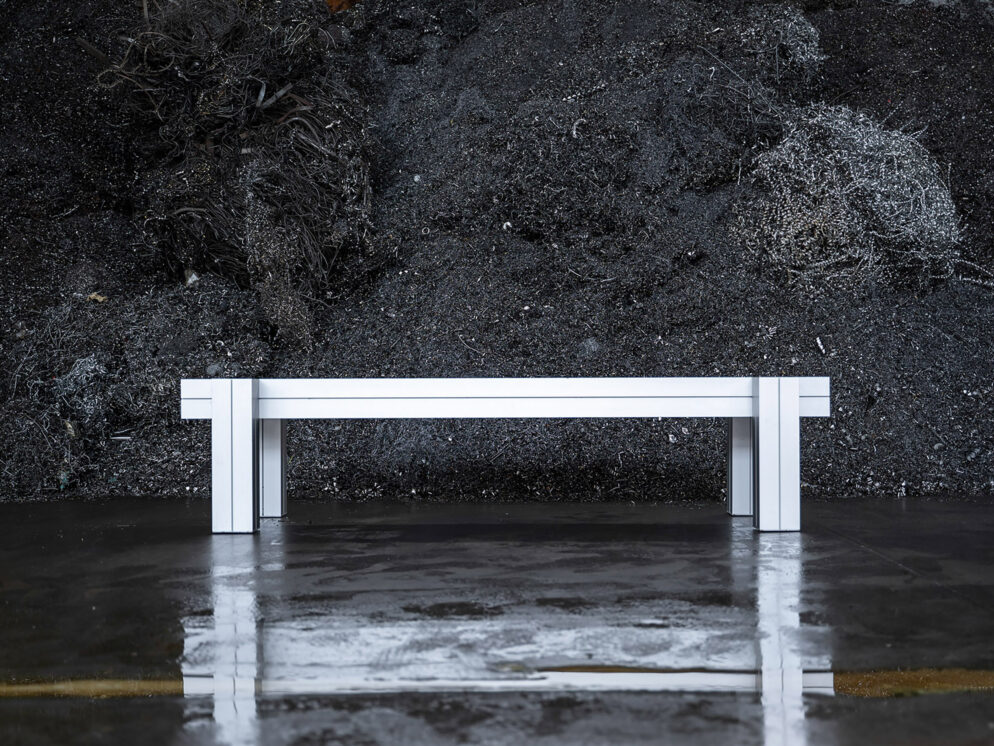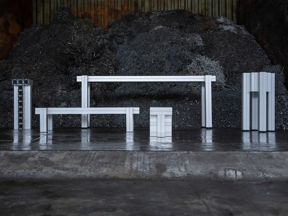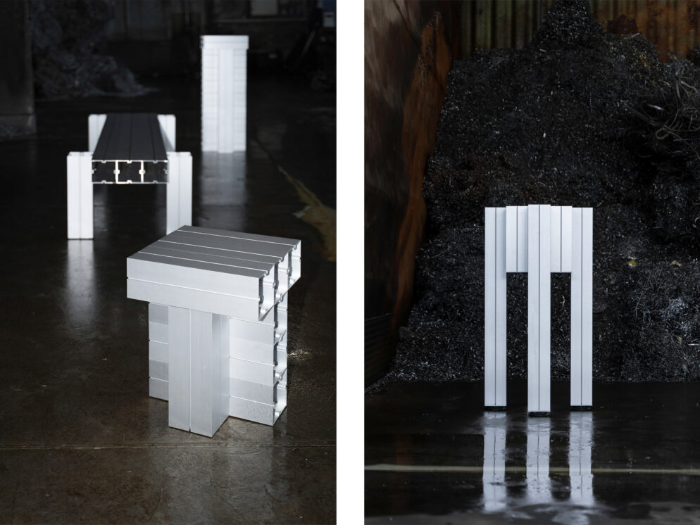 Die Möbel sind aus recycelten Aluminiumprofilen gefertigt und verbinden ökologisches Denken mit industrieller Ästhetik. Die 120 x 120 mm eloxierten Profile werden mit Schrauben zusammengehalten. Das gesamte System ist für Transport, Montage und späteres Recycling vollständig zerlegbar. Die Stücke werden in Deutschland handgefertigt und können im Innen- und Außenbereich eingesetzt werden. Als Beitrag zur Kreislaufwirtschaft können die Möbel auch gemietet werden.