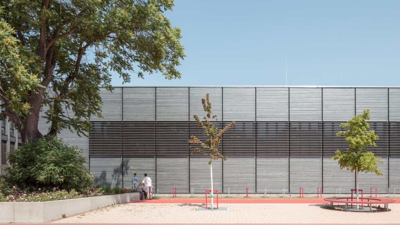 Die neue Sporthalle am Schilfweg in Dresden-Seidnitz ergänzt das Schulensemble als funktionaler, klar gestalteter Holzhybridbau. Ein vorgegraute Lärchenholzfassade, Betonsockel und feststehende Lamellen prägen das ruhige Erscheinungsbild. Der Massivbau-Sozialtrakt mit PV-Anlage und begrüntem Dach fügt sich in die Umgebung ein. Innen schaffen sichtbarer Holzbau, robuste Materialien und blaue Akzente eine freundliche Atmosphäre. Die Halle dient Schul- und Vereinssport, Begegnung und Gemeinschaft. Eine ebenso funktionale wie gestalterisch einfache Lösung mit Lowtech-Ansatz.