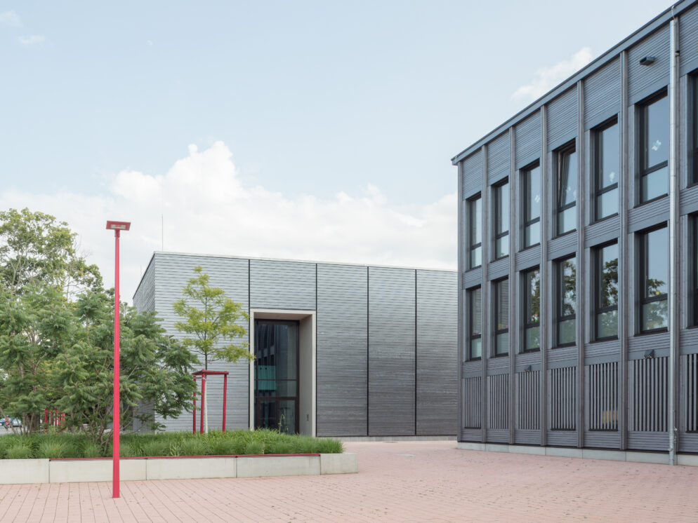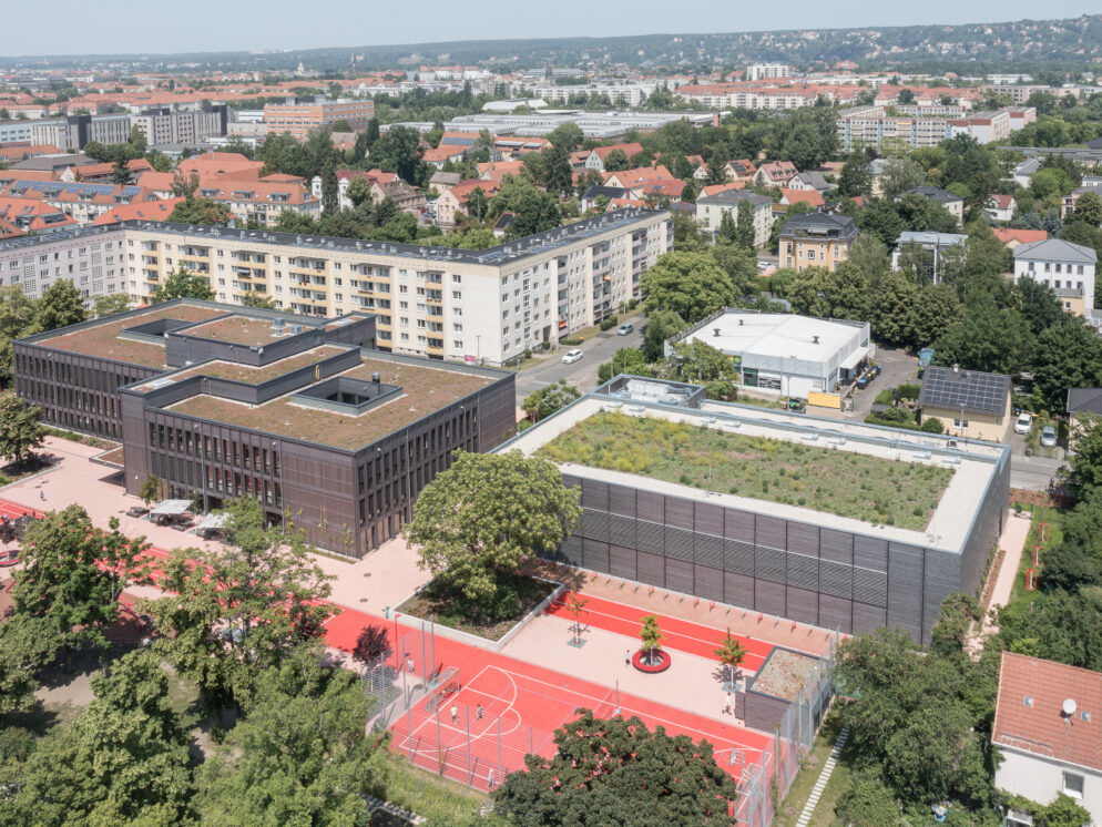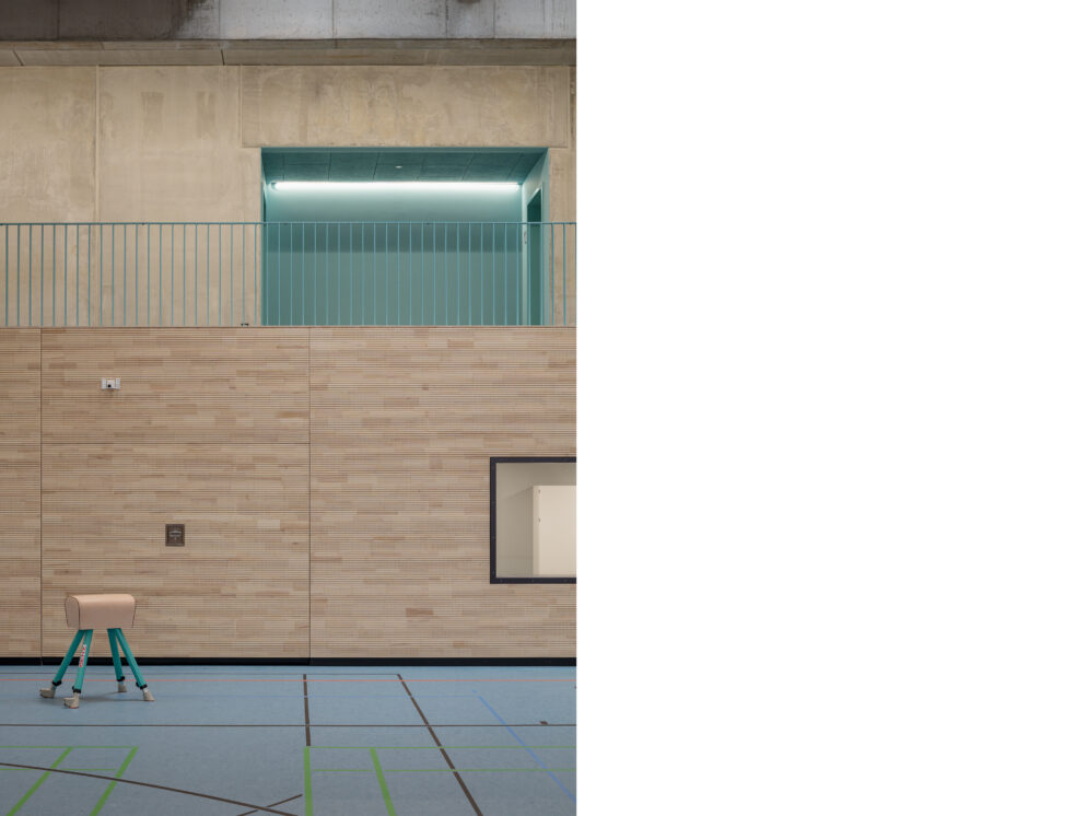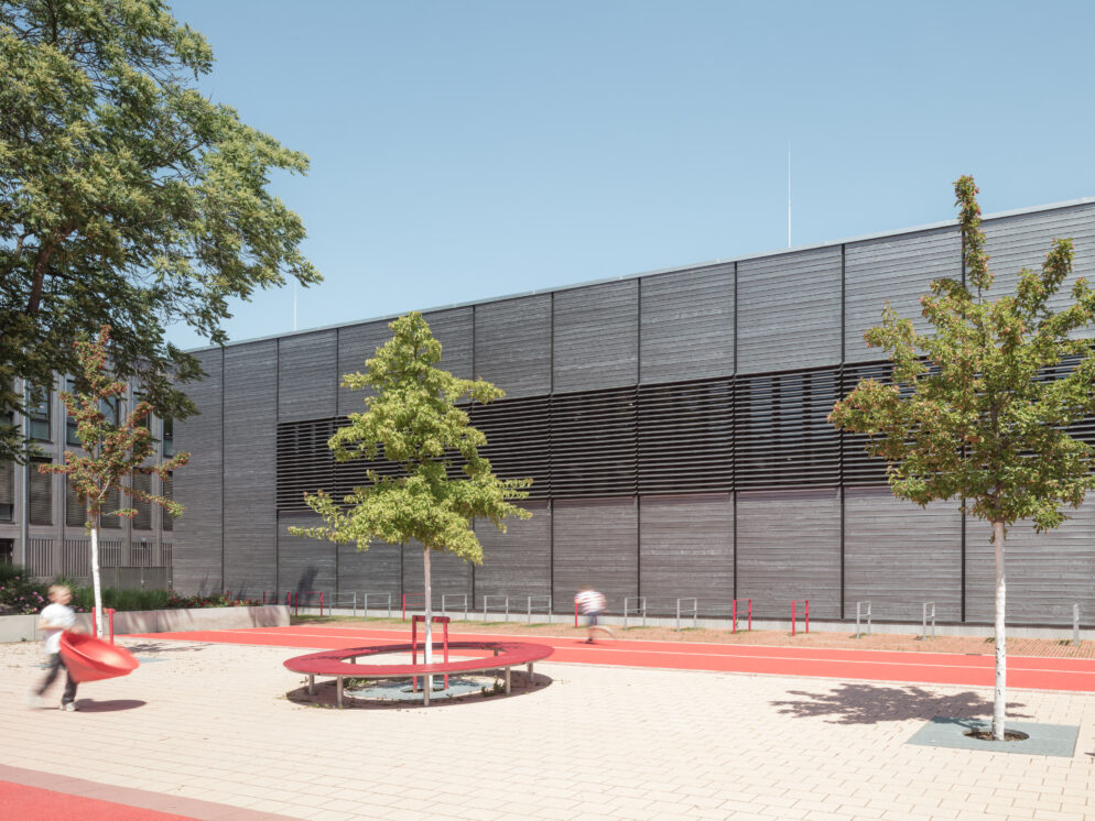 Die neue Sporthalle am Schilfweg in Dresden-Seidnitz ergänzt das Schulensemble als funktionaler, klar gestalteter Holzhybridbau. Ein vorgegraute Lärchenholzfassade, Betonsockel und feststehende Lamellen prägen das ruhige Erscheinungsbild. Der Massivbau-Sozialtrakt mit PV-Anlage und begrüntem Dach fügt sich in die Umgebung ein. Innen schaffen sichtbarer Holzbau, robuste Materialien und blaue Akzente eine freundliche Atmosphäre. Die Halle dient Schul- und Vereinssport, Begegnung und Gemeinschaft. Eine ebenso funktionale wie gestalterisch einfache Lösung mit Lowtech-Ansatz.