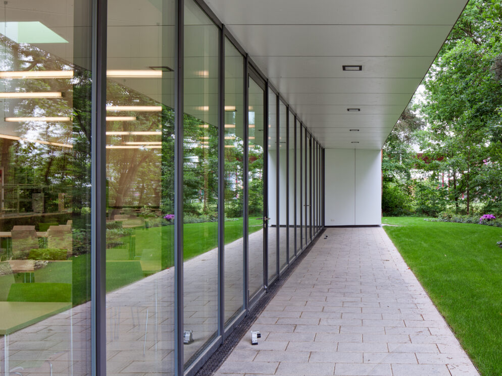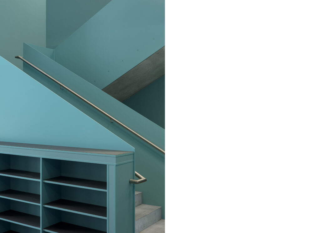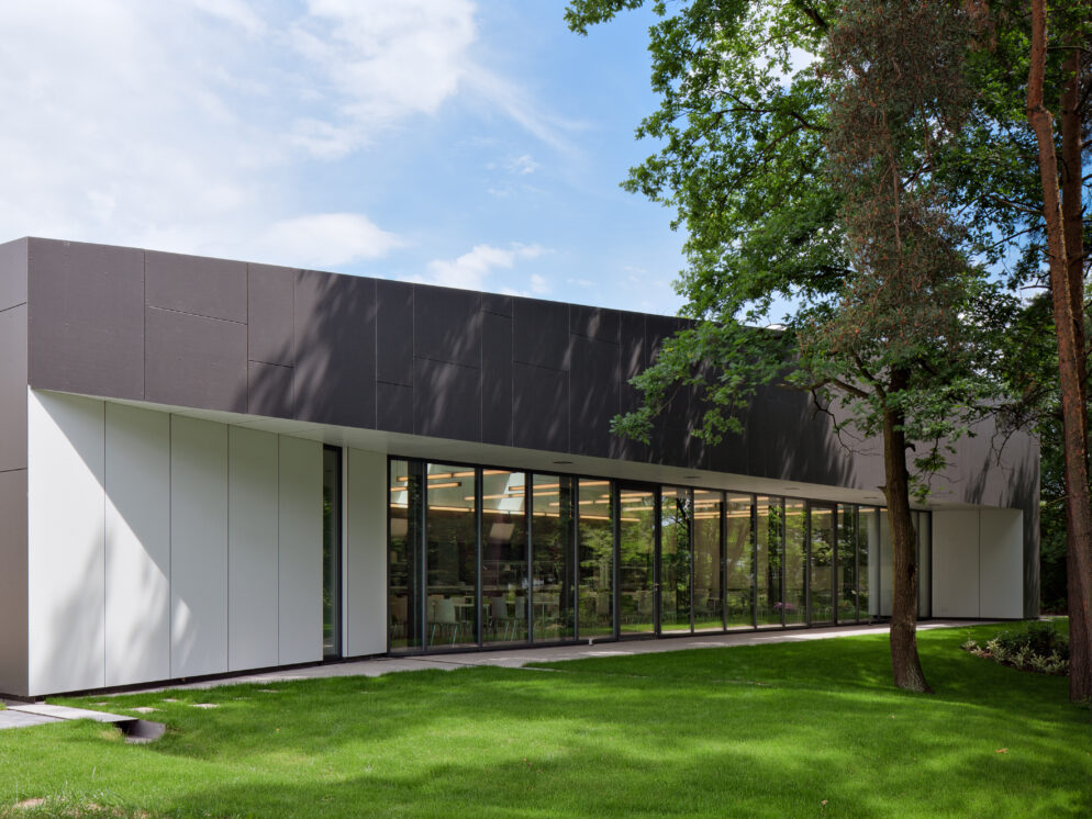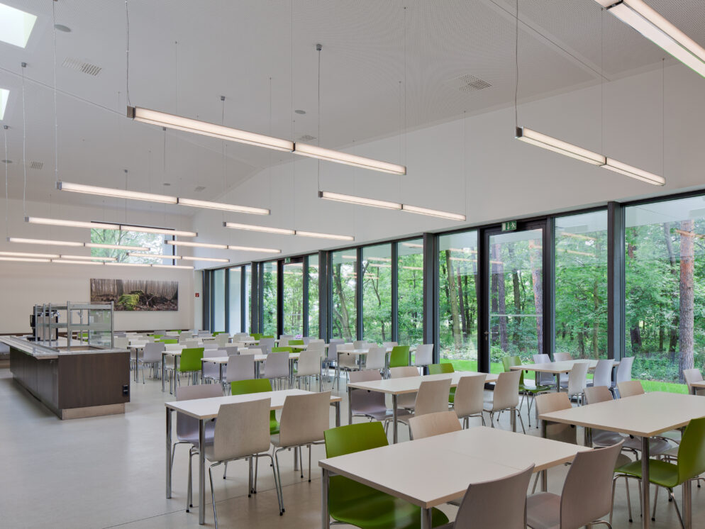 Die neue Mensa auf dem Gelände der Polizeihochschule fungiert als zentraler Treffpunkt und schließt den Erschließungsbereich nach Süden ab. Als „Haus am Wald“ integriert sie sich in die Freiflächen und nutzt das angrenzende Wäldchen als identitätsstiftendes Element. Der Speisesaal öffnet sich mit Terrasse zum Grün und bietet einen ruhigen Rückzugsort. Das flach geneigte Satteldach mit schräger Firstlinie prägt den Baukörper, im Inneren sorgt die nachgezeichnete Dachform für abwechslungsreiche Raumhöhen und eine lebendige Atmosphäre.