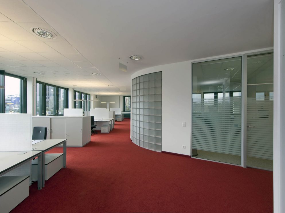 Interne Umstrukturierungen machten die Verlegung des Arbeitgeberservice aus Einzelbüros in einen Großraum erforderlich. Hierfür wurde ein «Sonderbaukörper« des Bestandes völlig entkernt und durch das Einstellen von raumhohen Baukörpern neu geordnet. In den Baukörpern sind die Sonderfunktionen wie Besprechungsräume, Teamleiterbüros und Teeküche organisiert. Die drei Teams des Arbeitgeberservice werden fassadennah und somit natürlich belichtet und um die eingestellten Baukörper herum angeordnet. Der rote Boden und eine Lichtwand geben dem Raum eine positive wohnliche Atmosphäre.